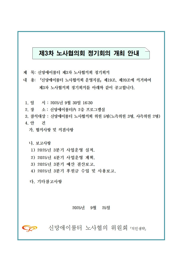 2025년 제3차 노사협의회 정기회의 개최 안내 페이지 정보 작성자 이지웅 작성일25-09-25 18:19 조회70회 댓글0건 관련링크 이전글 다음글 목록 본문 . 댓글목록 등록된 댓글이 없습니다. 이전글 다음글 목록