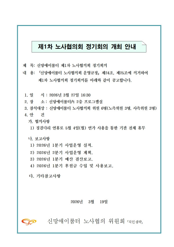 2026년 제1차 노사협의회의 개최 페이지 정보 작성자 이지웅 작성일26-03-19 09:04 조회4회 댓글0건 관련링크 다음글 목록 본문 . 댓글목록 등록된 댓글이 없습니다. 다음글 목록